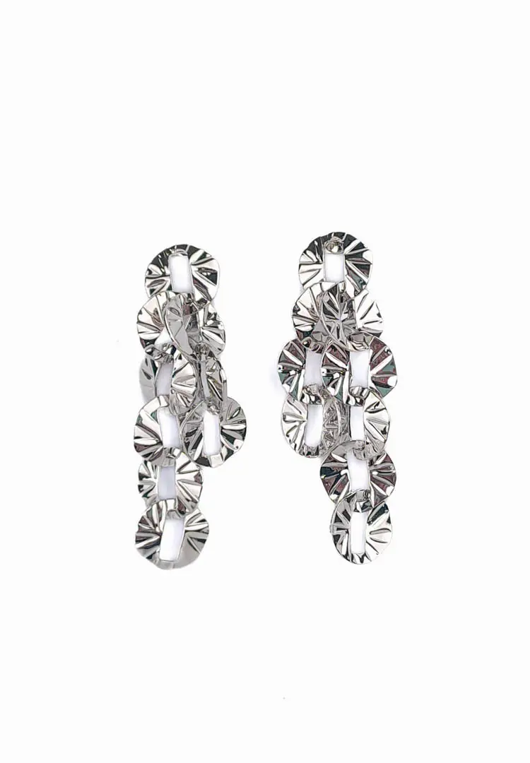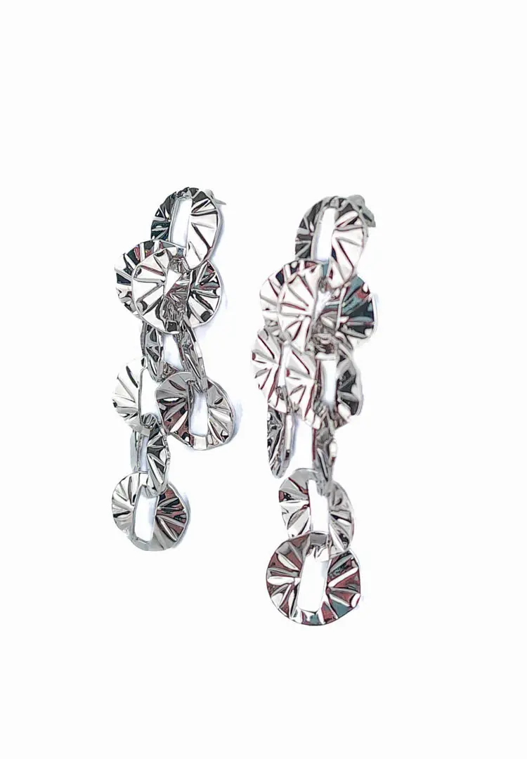 Trendy drop earrings crafted from high-shine silver-tone metal, featuring interlinked geometric discs with a crumpled textured finish. These bold dangles offer a modern, artistic look with a lightweight feel and secure push-back closure for day-to-night elegance.