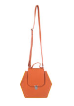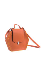 Hexagon shaped crossbody vegan leather bag in a warm earthy brown shade with yellow piping along the edges made of vegan leather featuring a front flap with a magnetic snap closure in a silver tone finish
