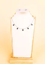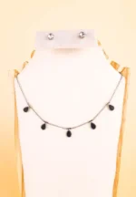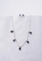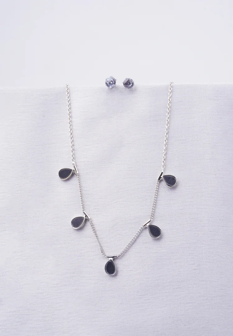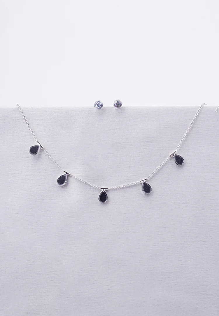 Set of accessories consists of a delicate gold-toned necklace adorned with small teardrop-shaped black charms along with a pair of stud earrings embellished with a small clear gemstone