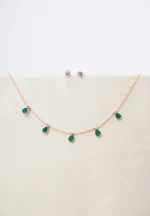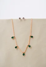 Set of accessories consists of a delicate gold-toned necklace adorned with small teardrop-shaped green charms along with a pair of stud earrings embellished with a small clear gemstone