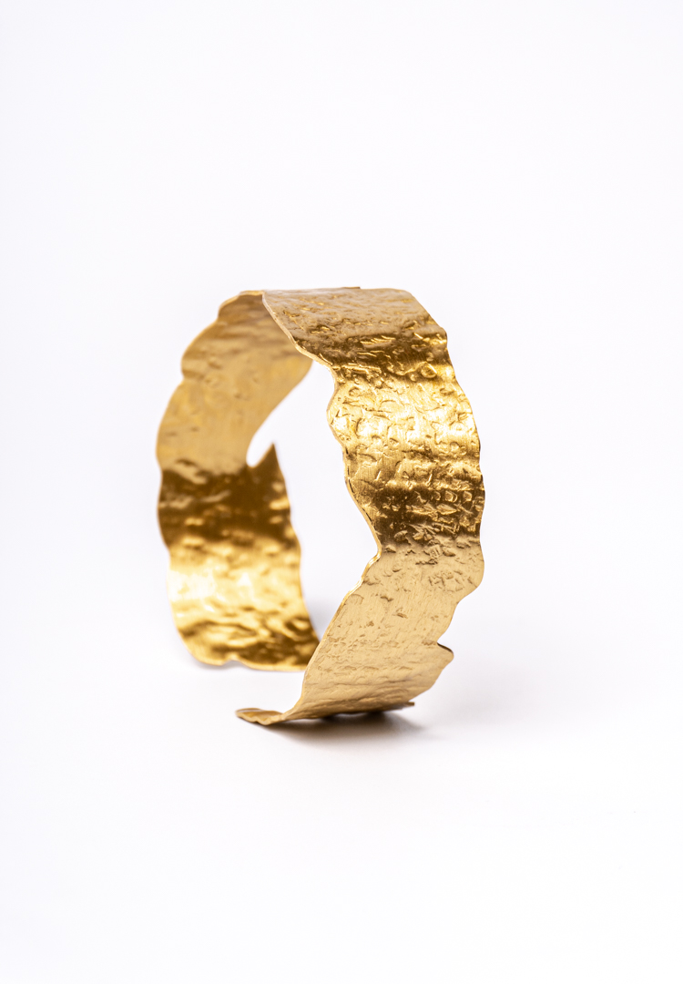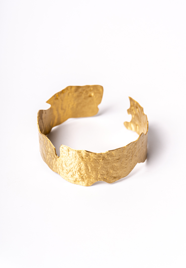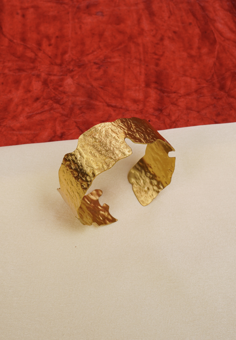 Asymmetrical cuff bracelet featuring organic shaped design with slightly wavy and irregular edges and hammered texture with gold-tone finish