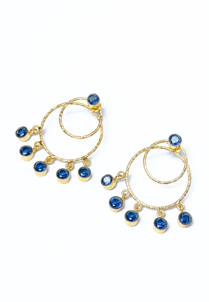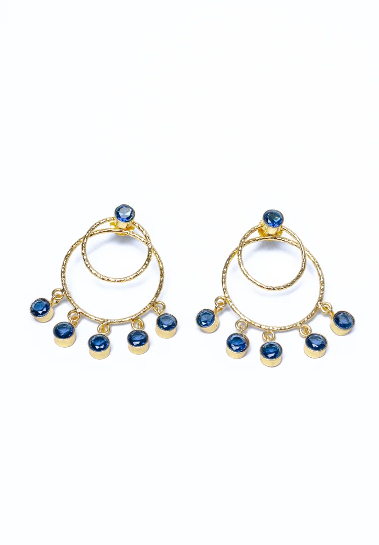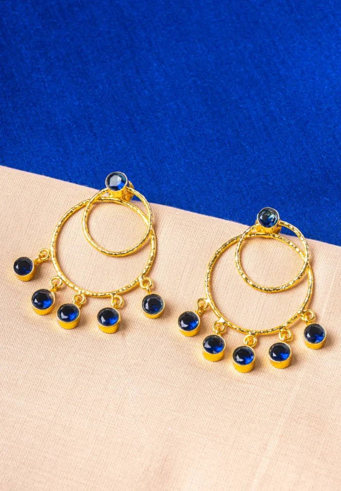 Metal hoop earring with hammered textured golden tone/navu blue finish featuring a small circular hoop on top overlapping a larger circular hoop adorned with a series of dangling blue coloured circular beads with a blue coloured stone on top with push back closure