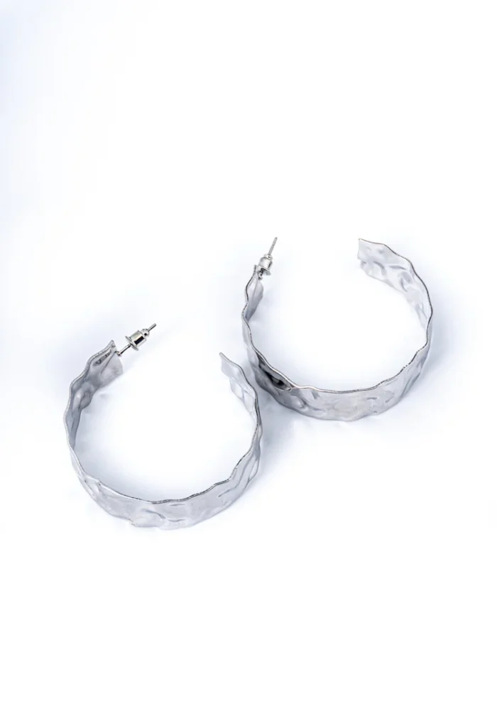 Hammered textured metal c hoop earring with polished silver tone finish and a push back post