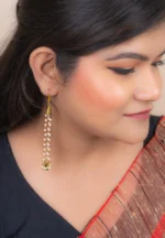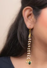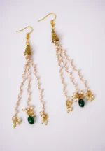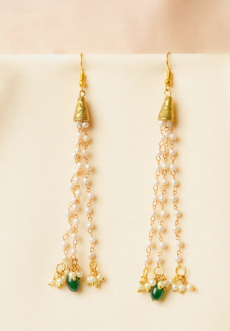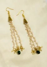 Chain tassel earring with gold-tone finish featuring tringuar shaped desgin with fine detailing at the top with delicate chain tassels adorned with evenly spaced small pearl beads and a green coloured oval shaped bead at the bottom with a french hook closure
