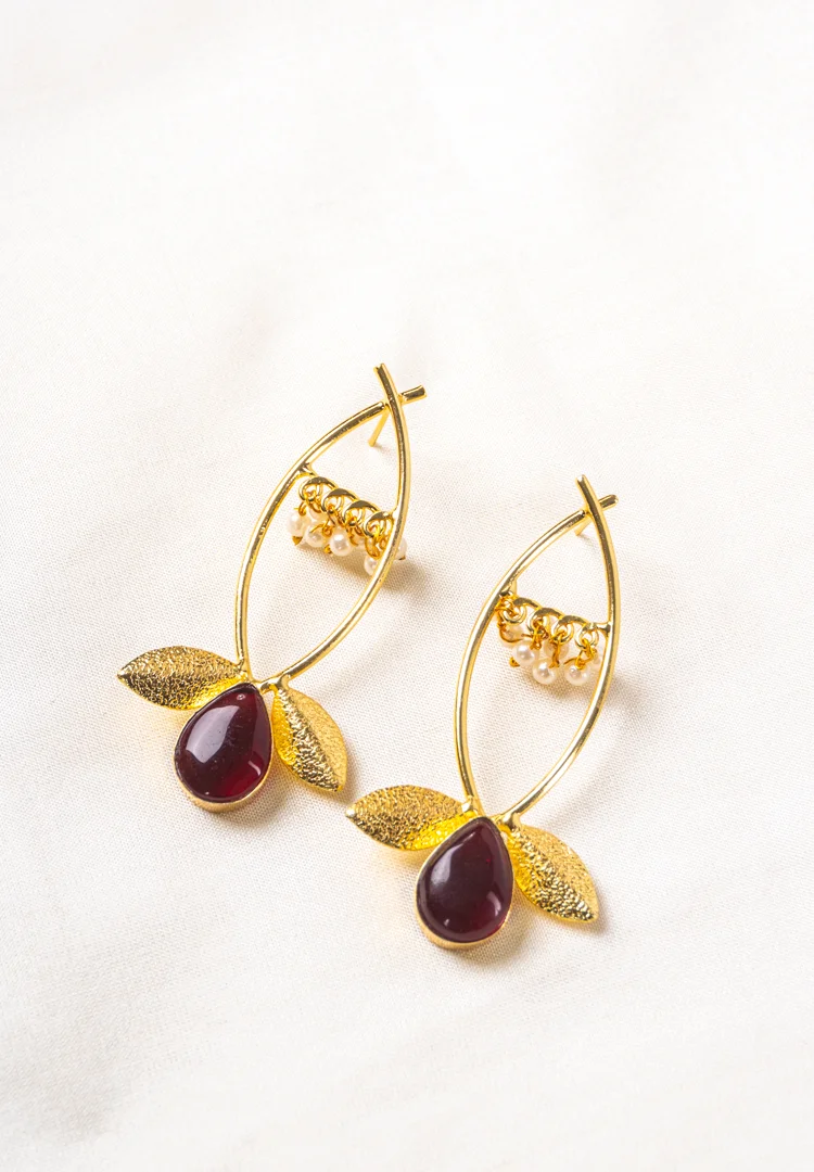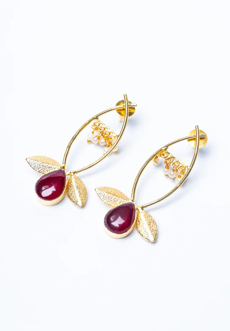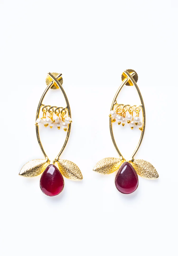 Floral structured metal drop earring featuring a series of dangling small pearl beads adorned with a red coloured teardrop shaped gemstone with two textured leaves at the bottom and a push back closure