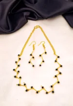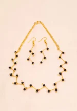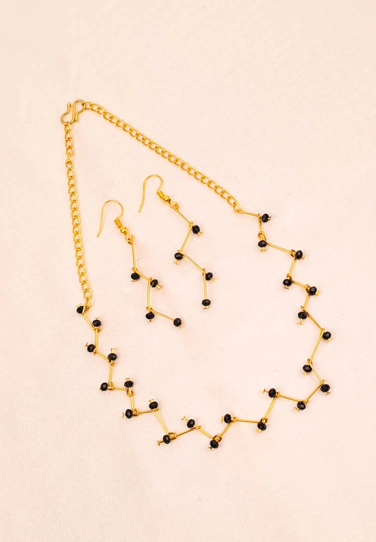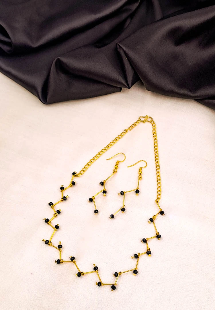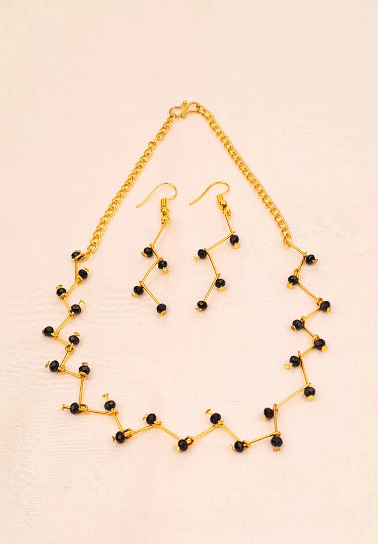 This Set of earring and necklace with delicate gold-toned chain adorned with small black beads, paired with matching earrings featuring zigzag patterns
