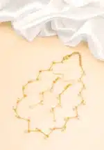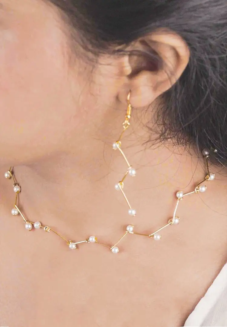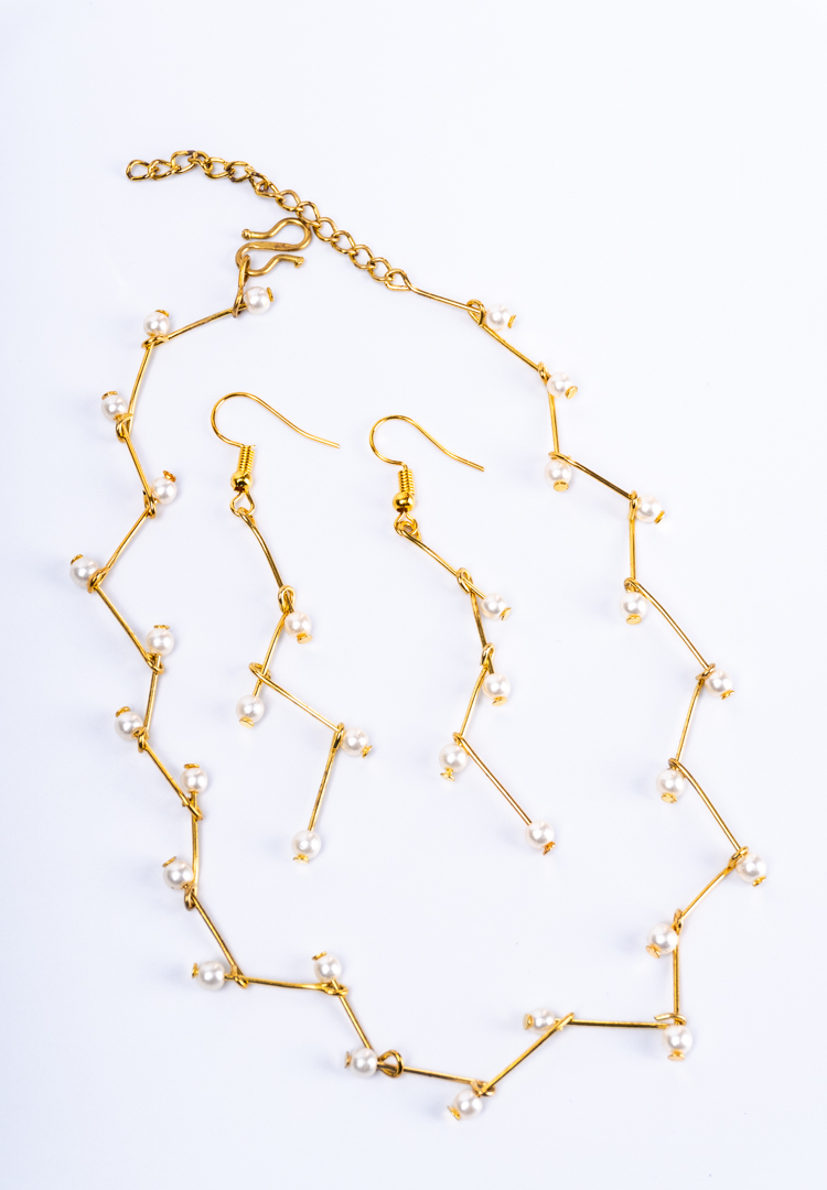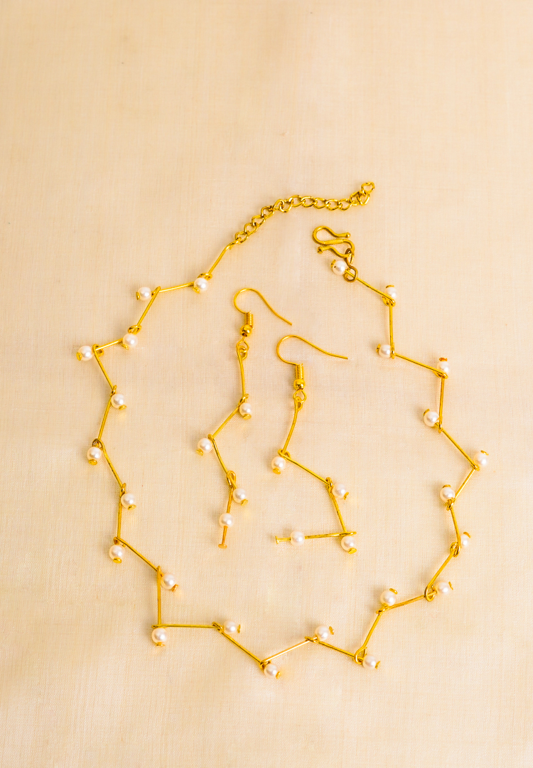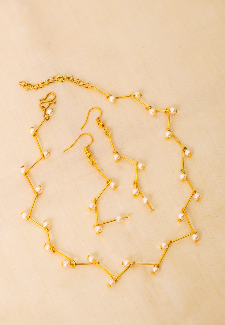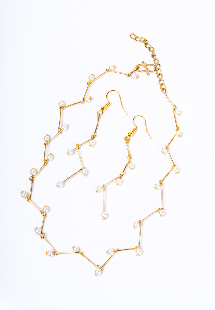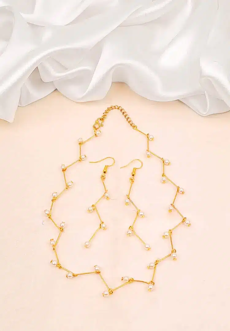 This Set of earring and necklace with delicate gold-toned chain adorned with small pearl, paired with matching earrings featuring zigzag patterns