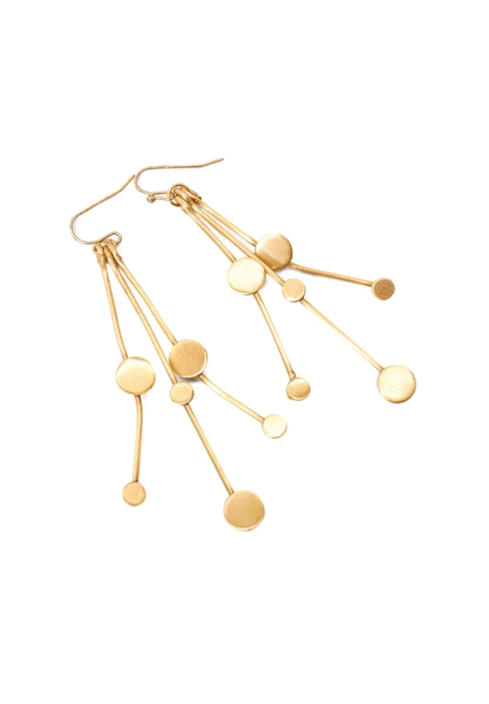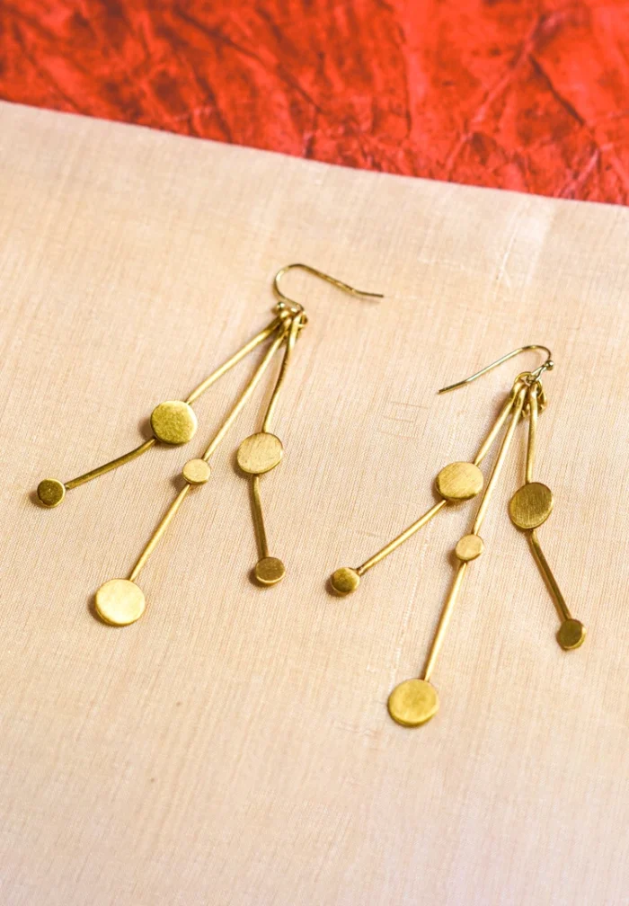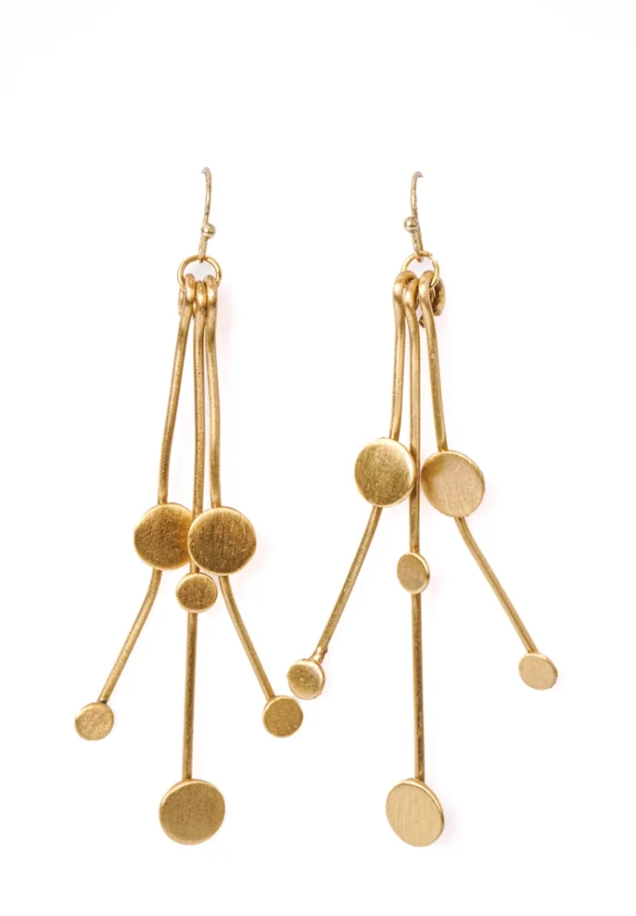 Geometric shaped brass earring with a french hook featuring three slinging stem structured wire with evenly spaced circular discs attached