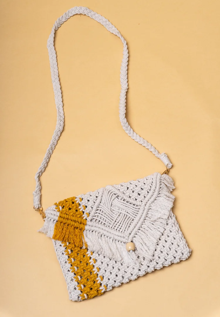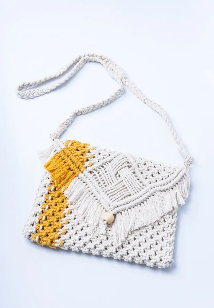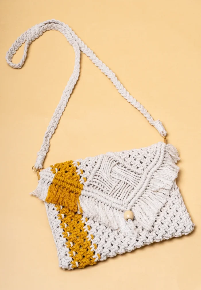 Striped patterned knitted macrame sling bag with yellow and white colour cords adorned with tassels and a large circular wooden bead in the center